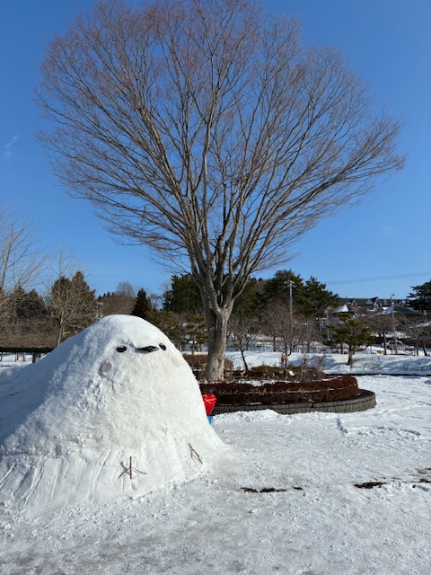 家の近くの平岡公園でウォーキング中に痩せた小さな雪だるまを見掛けました。「雪だるま」と言えば、丸いぽっこりお腹でふくよかなイメージを想像するのですが、作った人はきっと「小鳥」をイメージしたのかも知れませんね(笑い)