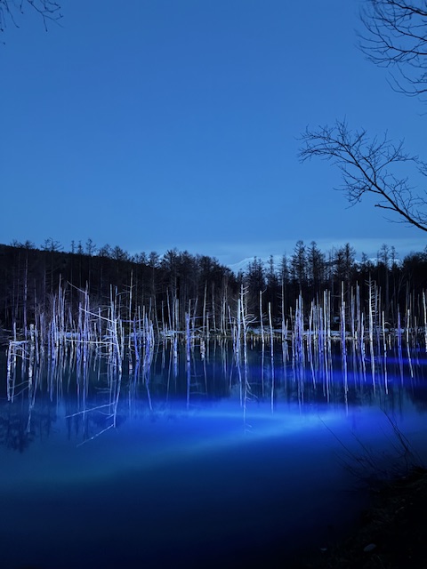 冬季間の美瑛の青い池は、夜間に(18:30~21:00)ライトアップすることで、普段見ることが出来ない姿を見ることが出来ます。この日は18:40頃に行ったのですが、駐車場には1台のみ。暗闇からいつクマが現れても・・・